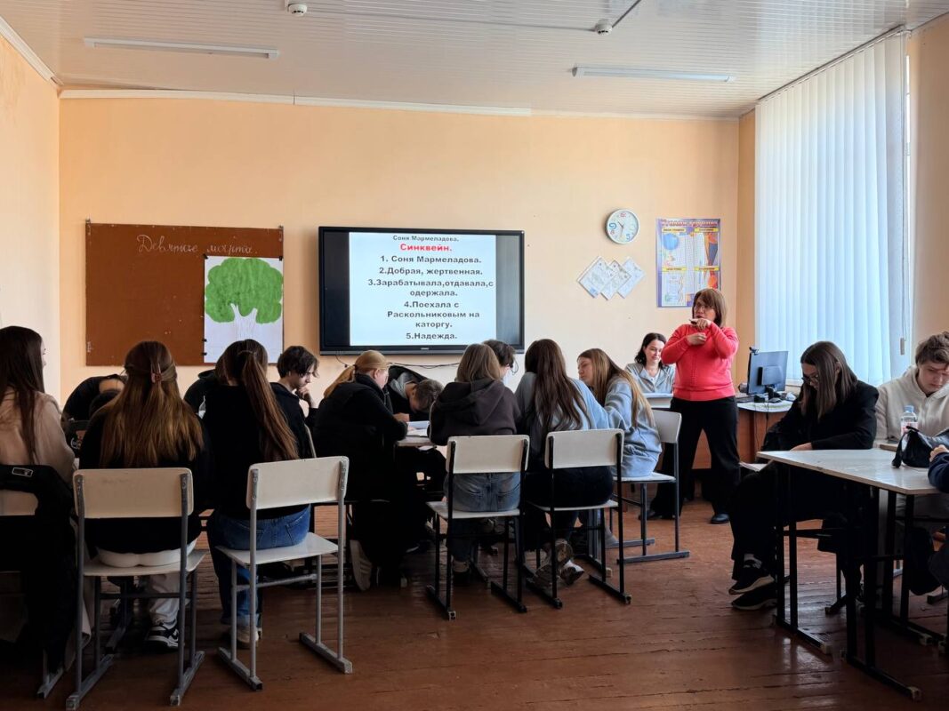 В ходе урока учащиеся анализировали художественные произведения «Преступление и наказание» и «Baltagul», сравнивали характеры героев, их поступки и нравственные ценности, отражённые в произведениях. Особое внимание было уделено обсуждению морального выбора персонажей и поиску справедливости.